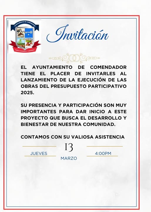 El Ayuntamiento de Comendador tiene el placer de invitarles al Lanzamiento de la Ejecución de las Obras del Presupuesto Participativo 2025.